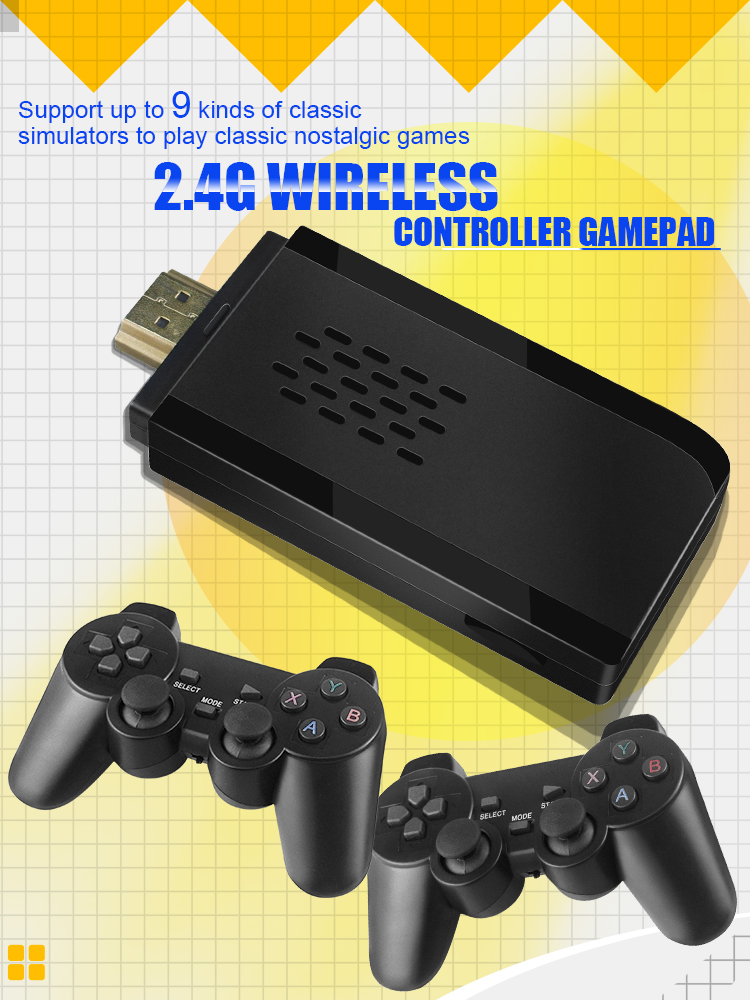 Wireless TV game console with more than 10000 kinds of rich games is installed, 9 emulators supporting multiple games are installed, and a 32GB TF card is attached. Use upgraded game chips to support 8-bit, 16-bit, 32-bit, 64-bit, 128-bit and other emulators. It perfectly meets your needs for image quality and game fluency.