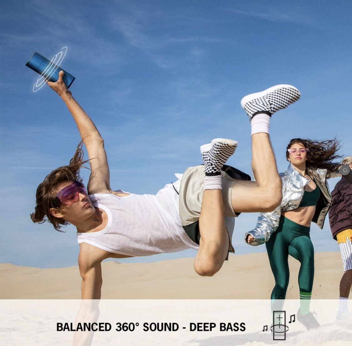 Ultimate Ears BOOM 3 is a super portable wireless speaker built for adventure. It rocks immersive 360° sound with deep bass, all carefully balanced so you can hear every note. But BOOM 3 also hangs tough. It’s seriously waterproof, dustproof, and drop proof which means you can bring vibes anywhere. From the desert festival to the pool party and everywhere in between. Plus BOOM 3 features the all new Magic Button so you can play, pause and skip songs directly on the Bluetooth speaker. And it is wrapped in a stunning, high performance fabric that shimmers. The ultimate go anywhere speaker just got more ultimate. Frequency Range 90Hz 20kHz