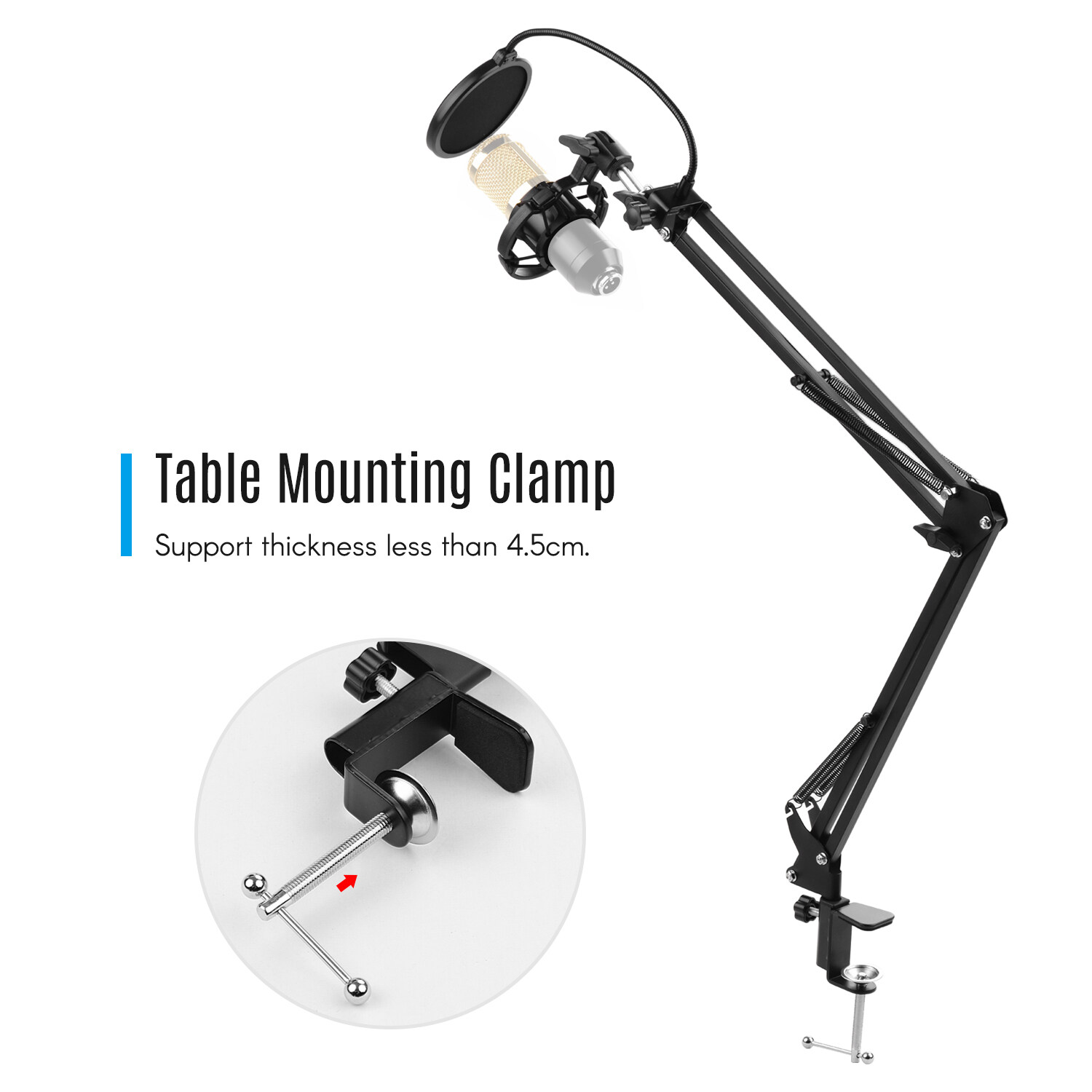 Feature: Microphone sci-ssor arm stand is designed for heavy duty carrying, good for studio recording, network broadcast, online singing, etc. Metal material, durable and sturdy, and max. load capacity is about 1kg. Folding adjustable design, portable and easy to adjust using angle and height to perfectly record your sound. Comes with a shock-proof mic holder, a table mounting clamp and a microphone windshield, for your convenient use. Shock-proof holder supports microphones in diameter of 48-51mm; the mic windshiled prevents unwanted "pop" noises, providing a clear vocal performance. Including a table mounting clamp, the microphone stand can be mounted on the table with thickness less than 4.5cm easily.Specifications: Color: Black Material: Steel Item Size: Detailed size refer to picture Item Weight: 323g / 11.4ozNote: The microphone showed in the picture is not included. Please check your microphone diameter before ordering.