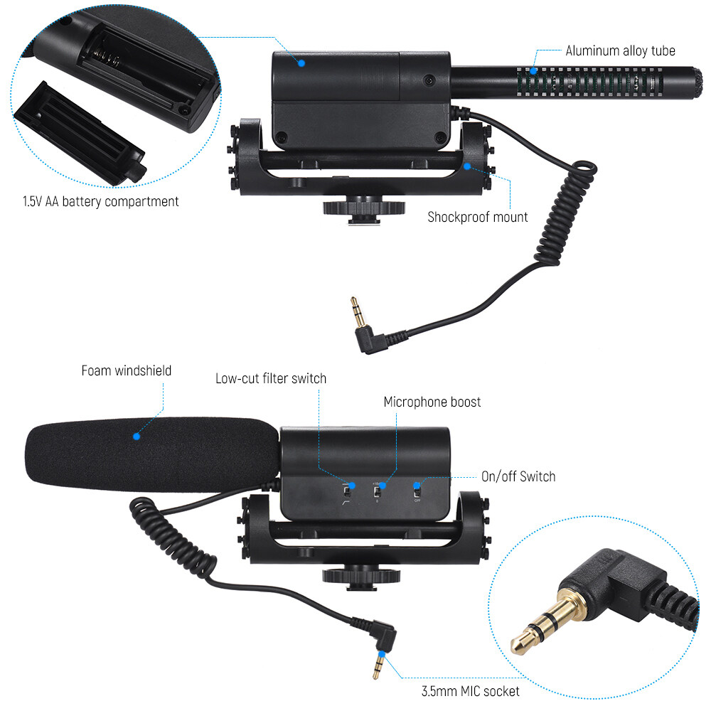Note: One 3.5mm MIC socket and one hot shoe are definitely required of your camera. Please notice the hot shoe before your purchase. Specifications: Transducer principle: Back electret condenser