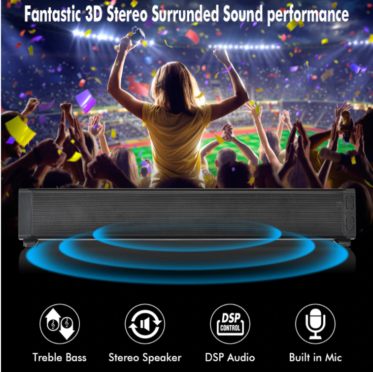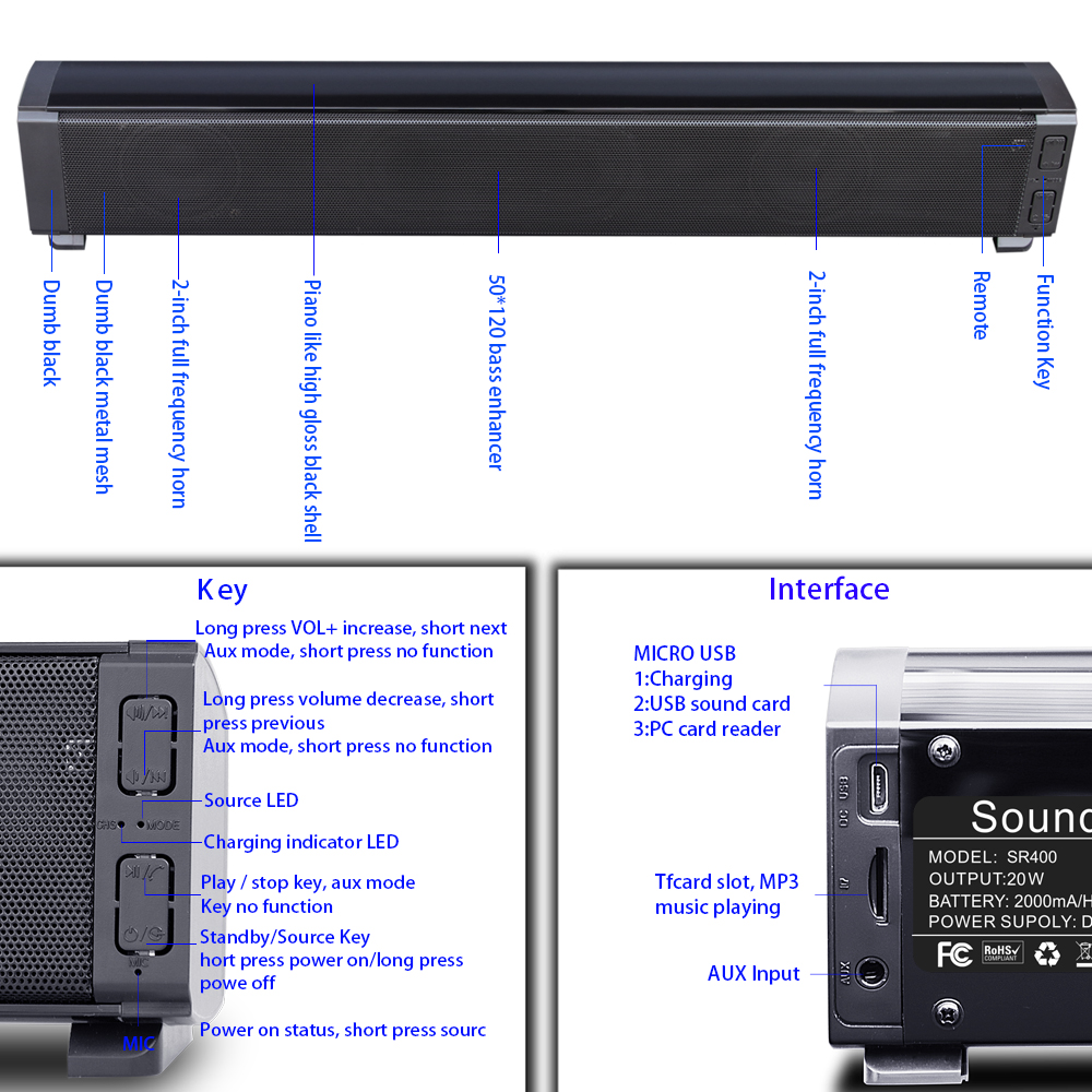 SR400 20W Bluetooth Soundbars Speaker with 2x52mm Horns Stereo TF Subwoofer Column Support 2 Sound Effects QE Treble/Bass Adjust
