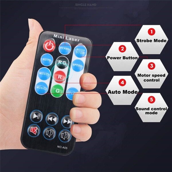 1.Input voltage: AC110V ~ 240V / 50-60HZ.2.Work mode: Auto play/Sound play.3.Best Projection Distance: 1-8m.4.Laser Source: High quality Laser Diode, Green: 532nm, Red:450nm,130; The designed laser spot (in the pattern) has a power of less and 0.1mw and can be used safely.5.Mode button: OFF- Auto Play - Auto Play + Sound play - Sound play - OFF.6.Sound mode: At Suitable range distance, with the music of the ring (bass), changes in the pattern of strong and weak.7.Auto play: patterns moving and change, in auto play have flash play, and With stop 2 seconds to run 2 seconds, running a separate color, alone laser color play and so on.8.Material: Black high-strength plastic housing.9.Warm-up time: 2 to 8 minutes.