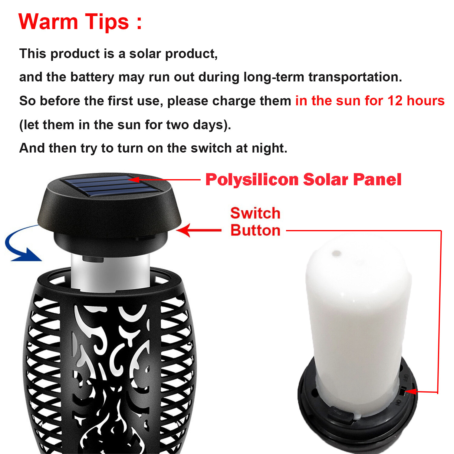1. Please make sure the switch is on. Cover the solar panel on the top of the light with your hand or flip it upside down, slightly push the on/off button to turn on the light to test if the solar light works. (The top can be opened and the switch button is inside. )