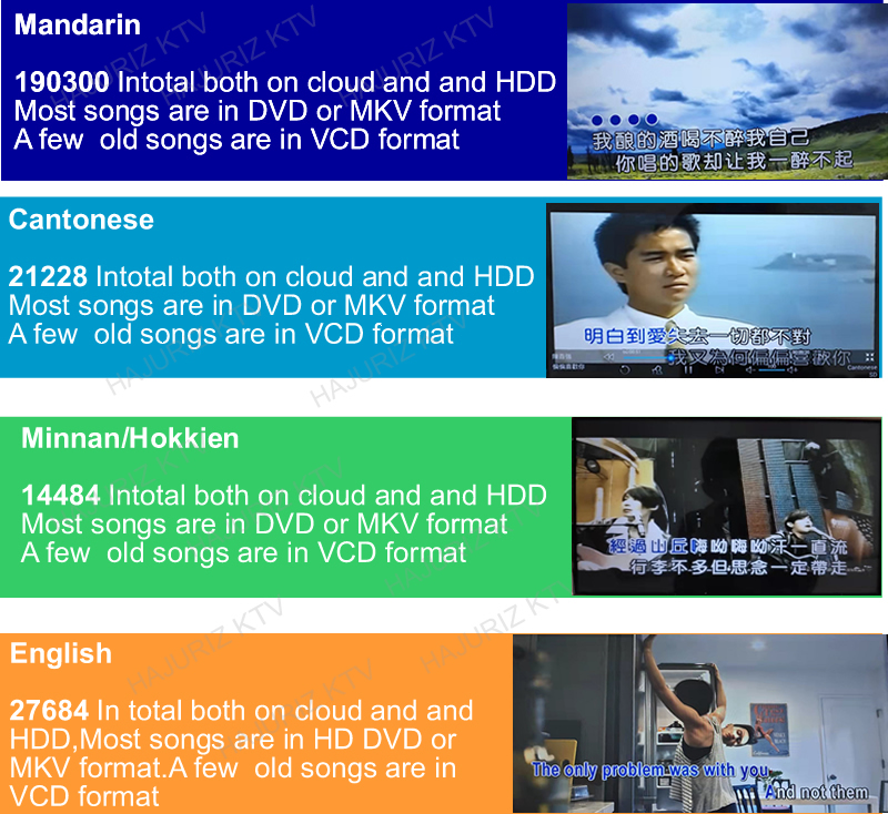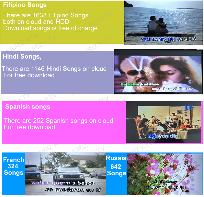 2.Download songs from cloud .There  are more than 400K different language songs(Mandarin,Cantonese,Taiwanese,Vietnamese,English,Korean,Japanese,Thai,Burmese,Malay,Filipino,Spanish,etc. More than 10 kinds of songs on cloud ) on Cloud for download.The system updates songs each every week.It will hint Synchronize new updates cloud songs if there are new songs.