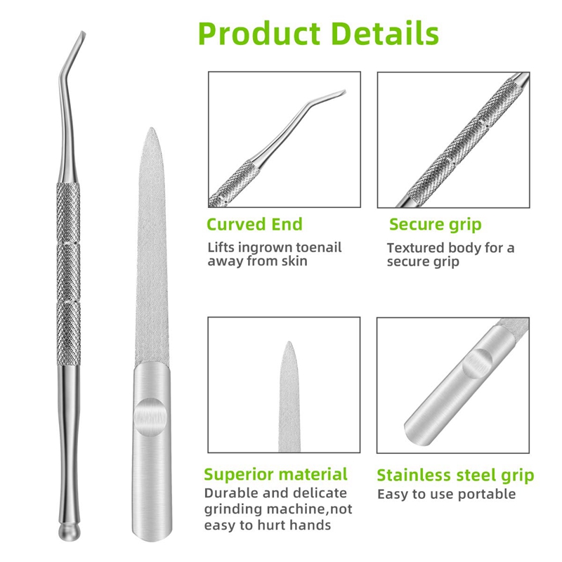 [SELECTED KIT] Professional ingrown toe nail clippers tools kit(4-in-1), superior stainless steel refined. It's hard, sharp, antirust and durable, so these nail tools are also the first choice for dealing with thick and hard nails. [UPGRADED CLIPPER] Nail clippers with non-slip ergonomic handle and large opening, takes less hand force to cut all size nails, including ingrown toenail, thick toenail, hard nail, grey nail, grooved nail etc. The sharp curved blade edge like eagle mouth fits the nail arc closely, is good at deeping into the nail groove to trim ingrown toenails. [SPECIAL FILE] This 4 side nail file can be used for manicure of hard and thick toenails and can make your nails smoothly. [SUPPORTING TOOLS]The 2-in-1 double ended pusher can push down cuticles, the polish gel residue,the dead skin and top coat on nails. The nail lifter with mini spoon can clean the debris or dirty inside nails. Tips: Be sure to push only one spring to the side of the cutting edge before use the clipper. Do not use the double spring at the same time Keep the set out of reach of children Pay attention to safety to avoid accidental injury Color: Black + Silver Material: Plastic + Metal Package Contents: 1 * Nail Lifter 3 * accessories