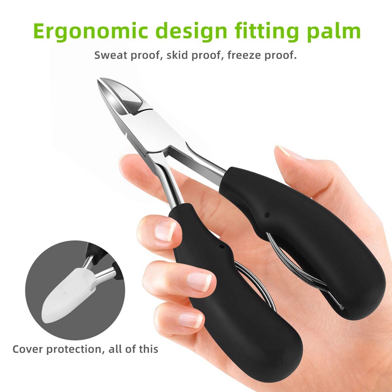 [SELECTED KIT] Professional ingrown toe nail clippers tools kit(4-in-1), superior stainless steel refined. It's hard, sharp, antirust and durable, so these nail tools are also the first choice for dealing with thick and hard nails. [UPGRADED CLIPPER] Nail clippers with non-slip ergonomic handle and large opening, takes less hand force to cut all size nails, including ingrown toenail, thick toenail, hard nail, grey nail, grooved nail etc. The sharp curved blade edge like eagle mouth fits the nail arc closely, is good at deeping into the nail groove to trim ingrown toenails. [SPECIAL FILE] This 4 side nail file can be used for manicure of hard and thick toenails and can make your nails smoothly. [SUPPORTING TOOLS]The 2-in-1 double ended pusher can push down cuticles, the polish gel residue,the dead skin and top coat on nails. The nail lifter with mini spoon can clean the debris or dirty inside nails. Tips: Be sure to push only one spring to the side of the cutting edge before use the clipper. Do not use the double spring at the same time Keep the set out of reach of children Pay attention to safety to avoid accidental injury Color: Black + Silver Material: Plastic + Metal Package Contents: 1 * Nail Lifter 3 * accessories