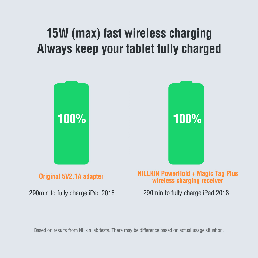 Flexible adjustment, accurrate alighnmentThe wireless charger needs to be aligned with the center of the tablet (Receiver coil)Compatible with tablets of different sizesCharge horizontally or verticallyTablets without wireless charging function need to be equipped with wireless charger receiver to start wireless charging15W (Max) fast wireless charging / Almost same speed of charging as using the original adapterMulti-angle adjustment - Relieve shoulder and neck pressureMulti purpose - Detachable design, stand and wireless charger can be use separatelyStable design - reinforced hinge to hold your device firmlyFolding and space saving designConveninet for storageAnodized aluminum alloy - CNC trimming , fine texture, rounded edgesNon slip design to protect your tablet in all round wayNon slip surface, non slip groove, non slip base