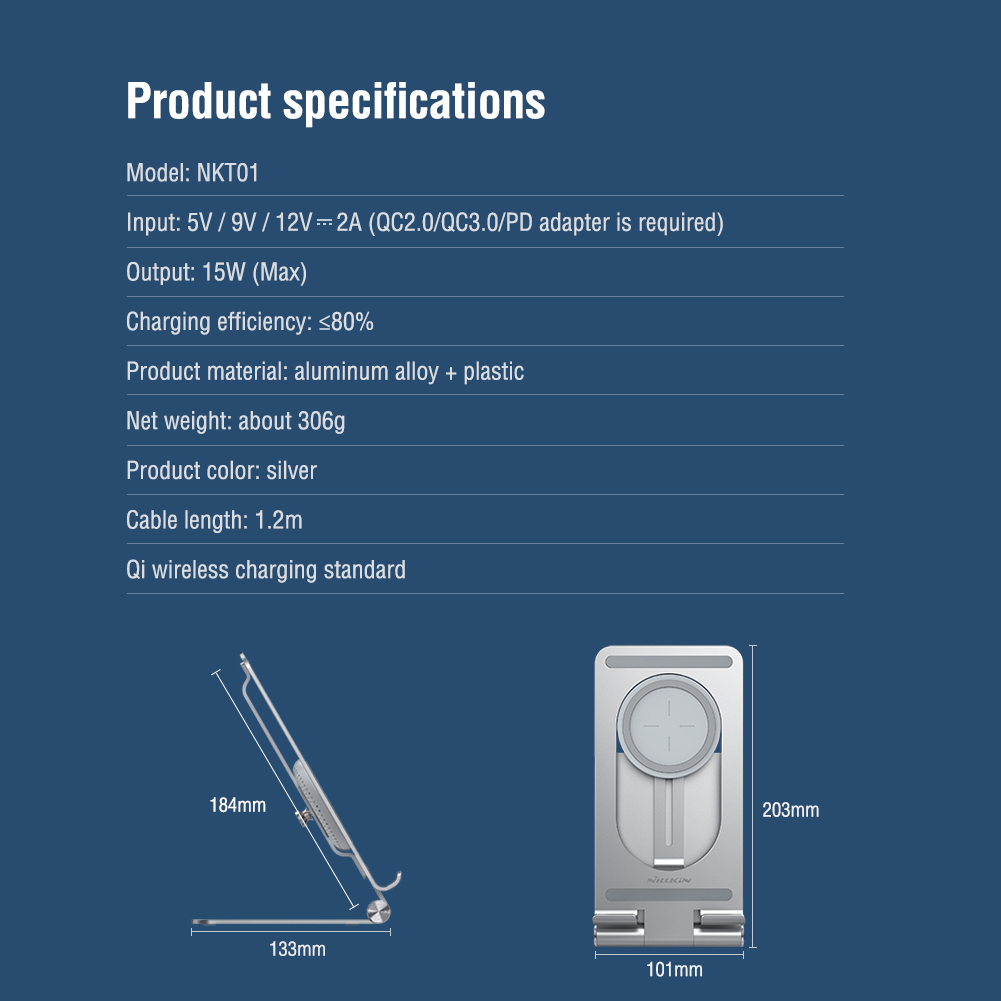 SpecModel: NKT01Input: 5V/9V/12VOutput: 15W (Max)Charging efficiency: Up to 80%Product Material: Aluminum alloy + plasticNet Weight: 306GProduct Colour: SilverCable Length: 1.2mQi Wireless Charging Standard