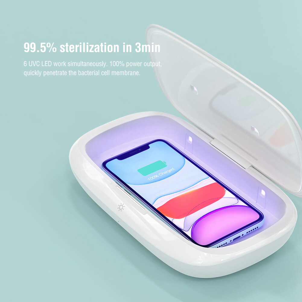 FlashPure Pro UV sanitizing box with wireless charger is a real practical product with sterilization and wireless charging together. UVC sanitizing rate up to 99.5%, which can make quick sterilization for daily carry-on items in 3 minutes. The box not only sterilizes mobile phone, but also charge the phone at the same time. It adopts the technology of pure physical sterilization, environmental friendly and safety, care for your family’s health. Portable size, easy to carry in your business trip.
