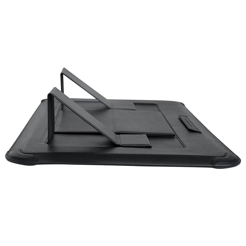 It is not only a storage bag, but also laptop stand and mouse mat. Adopt preferred PU, which is scratch-resistant and durable. Use sponge flannel lining inside for shock absorption. Equipped with magnetic stand to speed up the laptop cooling.