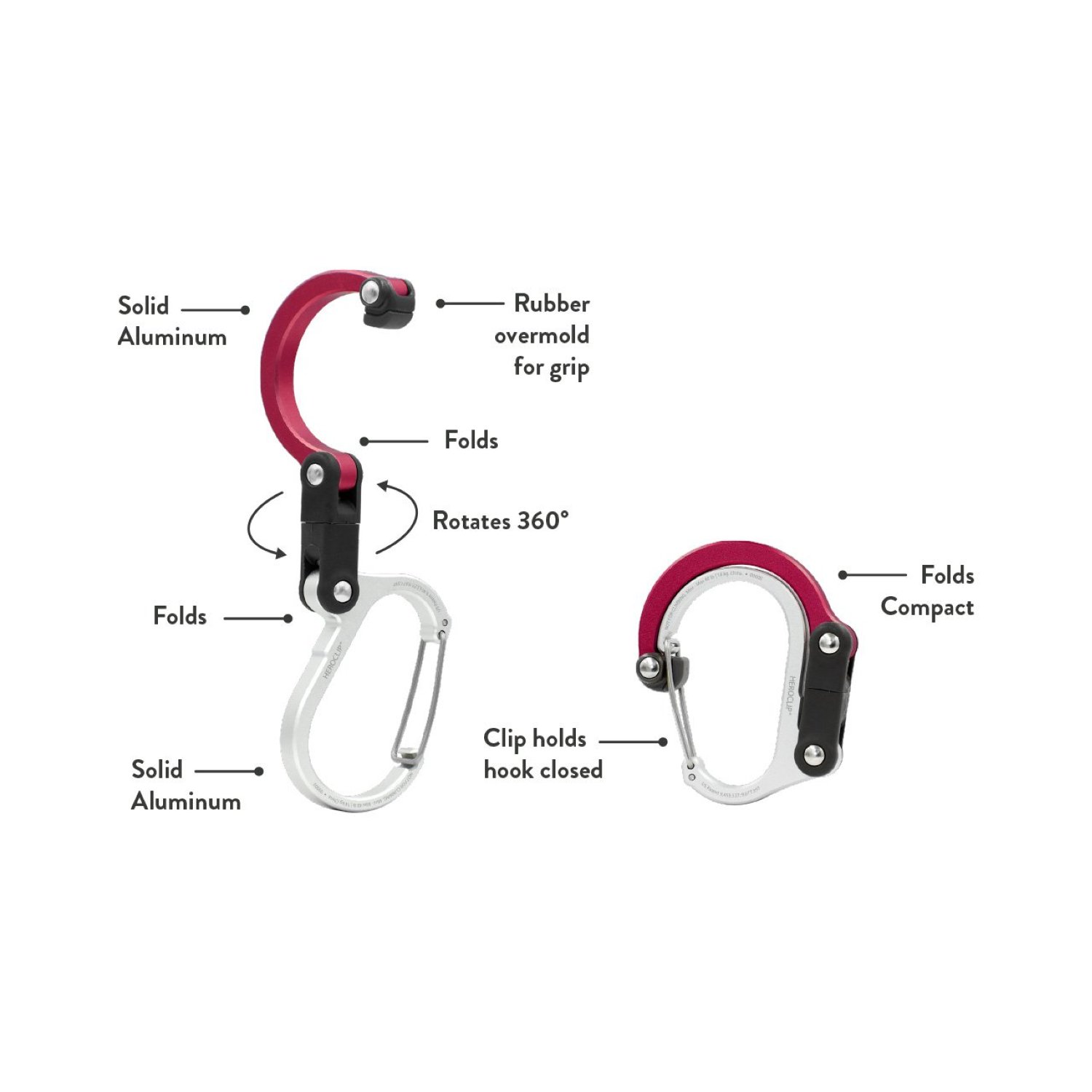 Our tiny but mighty Heroclip Mini gear clip lets you hook and hang small items, such as bags and toiletry kits from towel racks, lights from a tent or a tree branch, or tiny speakers from a wire shelf. And the mini size is perfect for slipping into a pocket or purse, so you have an extra helping hand whenever you need it. This versatile gear clip hangs securely, rotates 360 degrees, and folds compactly in ways other carabiners, clips and hooks can't, helping you keep your gear organized and exactly where you want it, no matter the activity. The clip also features a wider clip gate compared to standard carabiners and clips, and a hook with a grippy rubber tip.