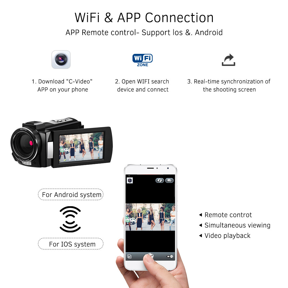Supports WiFi connection, after connected with the camera via WiFi, video and photo can be controlled and shared by downloading APP "C-Video" on smartphone; Hot shoe mount for connecting external microphone or LED video light, standard 1/4 inch thread for mounting the camera on tripod stand; comes with remote control for convenient usage.
