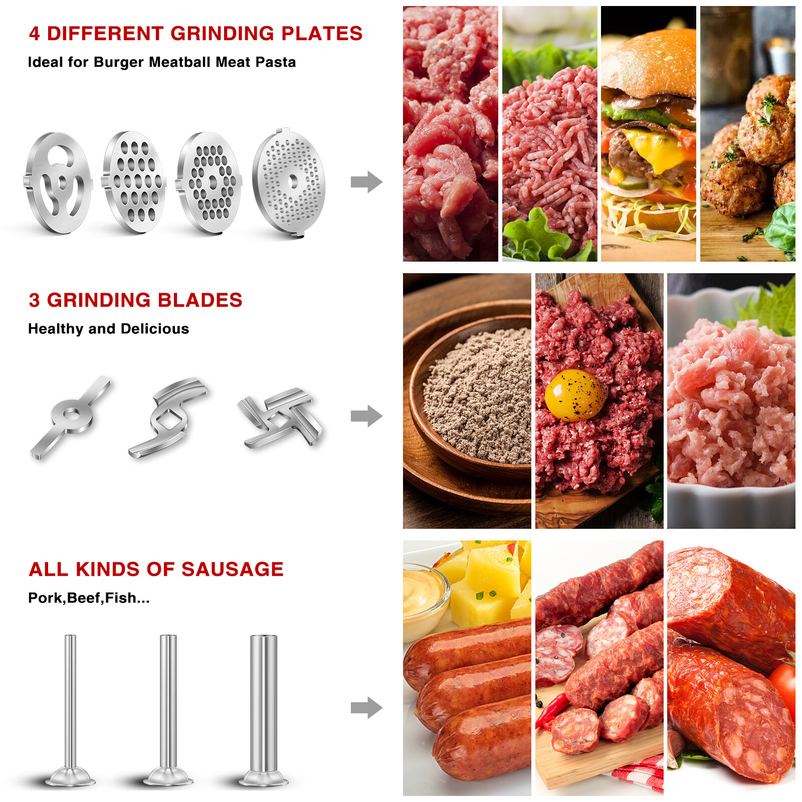 2.This lovely and practical food grinder attachment provides almost every function we need, to grind meat, make sausage, even make a large amount of mashed garlic, minced ginger paste or chili sauce...