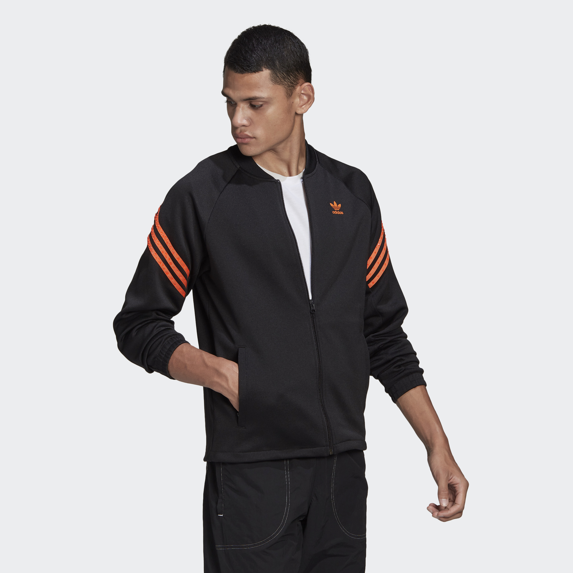 Small details, big impact. Which is exactly what this adidas track top has. In collaboration with Swarovski, the bold layer stands out with crystals that glow under UV light on the iconic 3-Stripes. Literally, it's time to shine.