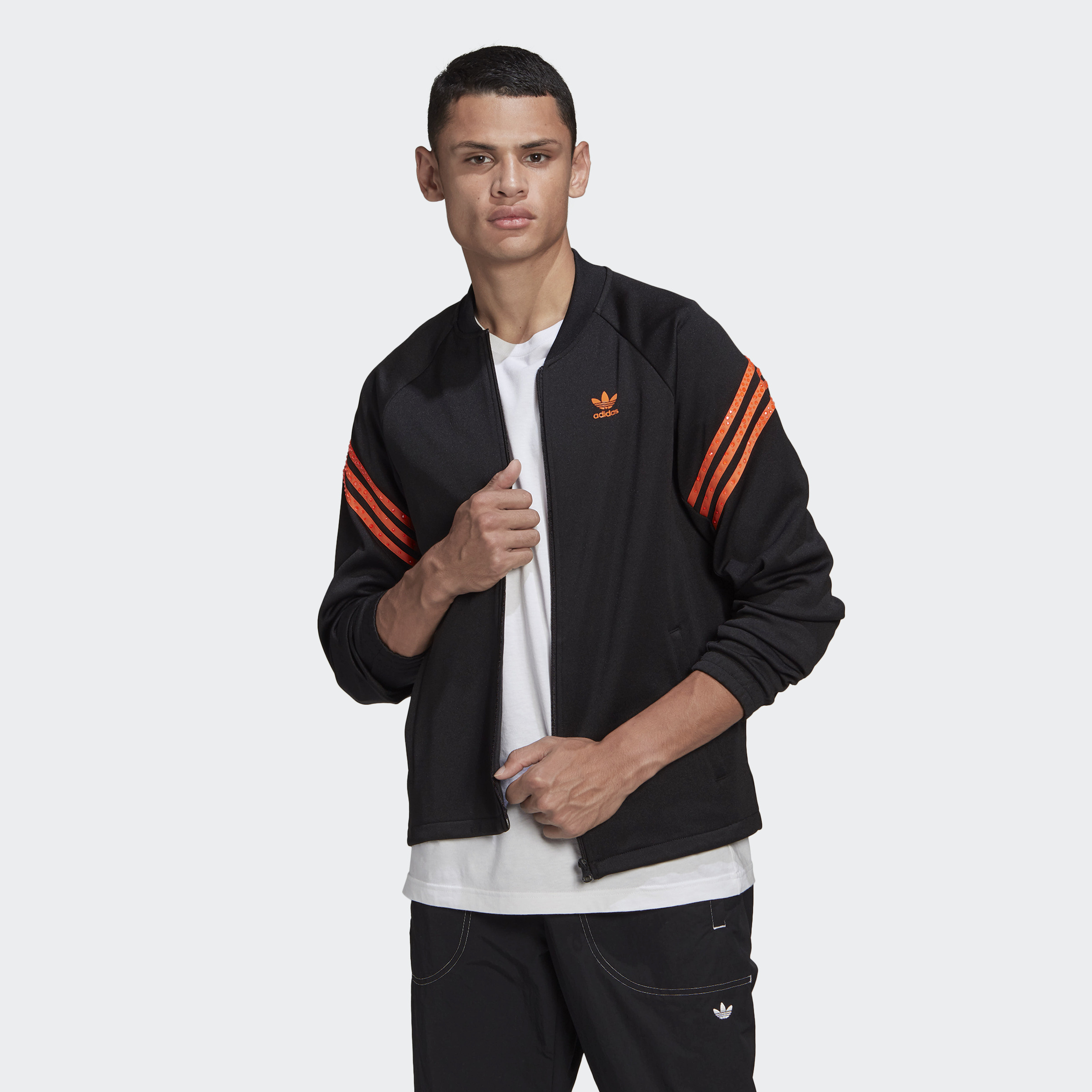 Small details, big impact. Which is exactly what this adidas track top has. In collaboration with Swarovski, the bold layer stands out with crystals that glow under UV light on the iconic 3-Stripes. Literally, it's time to shine.
