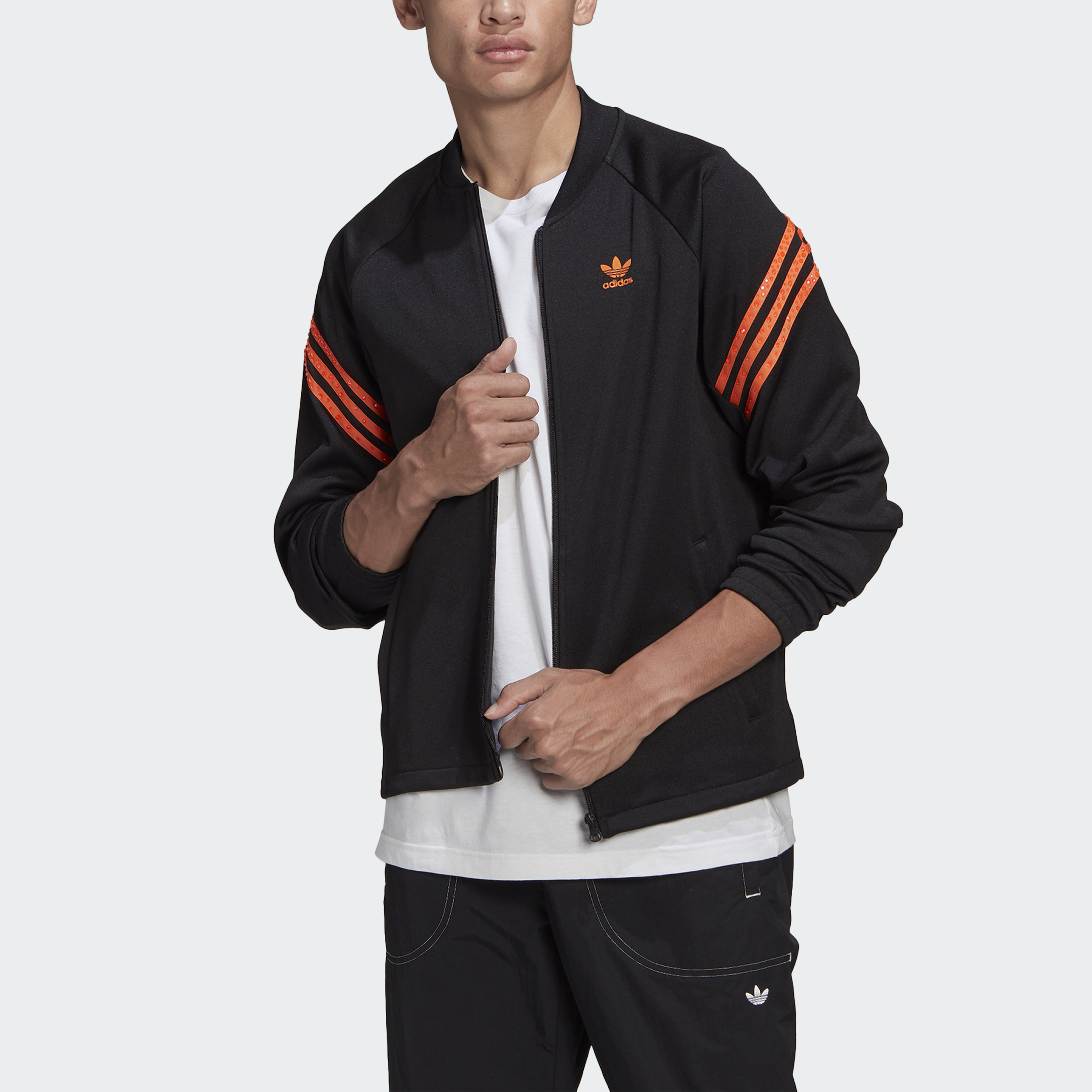 Small details, big impact. Which is exactly what this adidas track top has. In collaboration with Swarovski, the bold layer stands out with crystals that glow under UV light on the iconic 3-Stripes. Literally, it's time to shine.