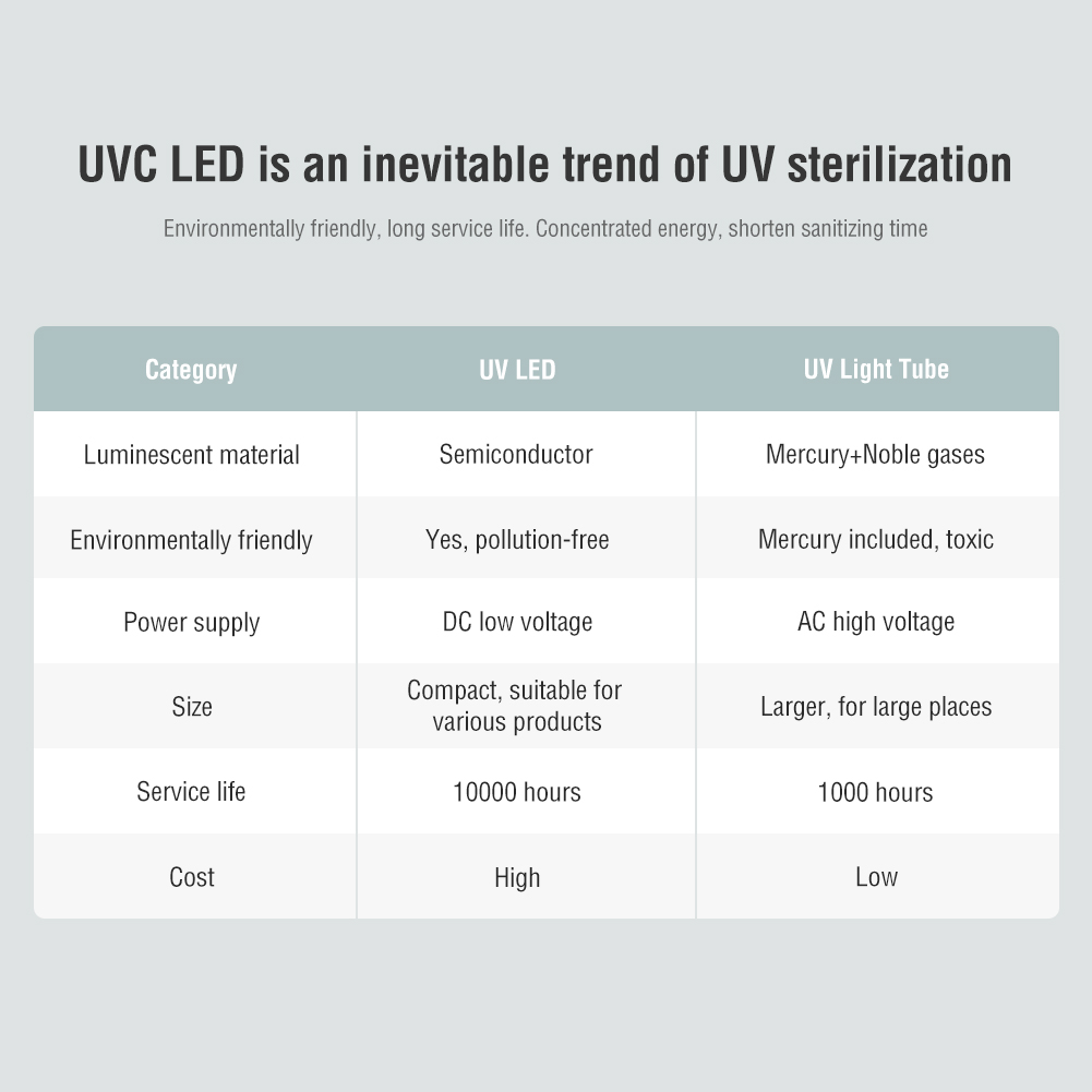 UVC(270-280nm) - Dedicated wavelenght for sterilization and disinfection, which can destroy the DNA/RNA molecular structure of microbial and kill all kinds of germs.