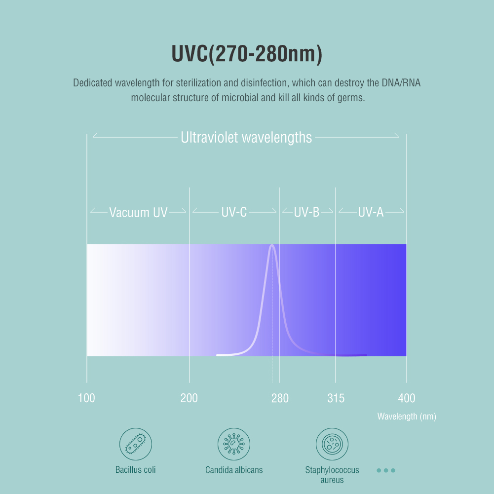 UVC(270-280nm) - Dedicated wavelenght for sterilization and disinfection, which can destroy the DNA/RNA molecular structure of microbial and kill all kinds of germs.