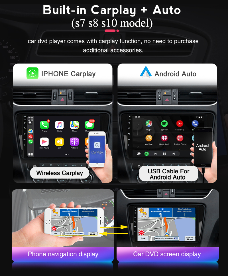 • support apple wired car play+apple wireless car play+android auto