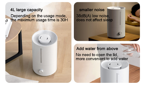 Main Features:Add water from above, easierSay goodbye to the traditional way of adding water from below, Mijia humidifier can add water directly from above. The separate design of the water tank makes adding water and cleaning more convenient.Sufficient amount of heavy fog, moisturizing all dayThe 4L large-capacity water tank is equivalent to 16 bottles of 250mL mineral water. 280mL/h strong fog volume, 10 square meters bedroom can humidify at least 9% in one hour, and relieve dryness faster. The longest humidification time can be up to 36 hours, and there is no need to add water frequently.Silver ion antibacterial material, humidification water source does not polluteThe main components of the water tank and the wading base use silver ion materials, which can effectively inhibit the growth of E. coli and Staphylococcus aureus, and the antibacterial rate can reach 99%.Light tone humidification, moisturizing does not disturbThe Mijia humidifier reduces the sound of large particles of water mist flowing and reduces fan noise, and the working sound does not exceed 38dB. The indicator light is soft and without halo, and it is not dazzling in the dark. Low noise, good sleep, comfortable sleep and moisturizing all night.Refuse to wet the table, the humidity is only in the airThe high-frequency ultrasonic atomizer vibrates 1.7 million times per second at high speed to break up water particles. The built-in baffle blocks the large particles of water, leaving only the fine water mist directly into the air through the oblique straight air duct, and the water mist is ≥50cm from the table.Large diameter designThe upper mouth of the Mijia humidifier has a diameter of 14cm, and the open mouth is easy to scrub. The sleek and delicate internal structure reduces the dead spots that hide dirt. The water tank is light and easy to lift, making cleaning more labor-saving.Double protection systemAfter the water tank is lifted, humidification is stopped. When the water source is exhausted, the machine does not dry and the orange indicator light reminds the lack of water. Double protection makes humidification safer.Stepless adjustment of the amount of fog, choose as you likeLow fog volume | Middle fog volume | High fog volumeSmall, it can be placed anywhereSmall space water storage boxReduce water storage, reduce bacteria breeding environment, humidify safe and cleanWaterproof membrane grooveBalance the air pressure of the water tank to prevent the machine from stopping workingUltrasonic welding technologyImprove product tightness and reduce the possibility of bacterial survivalSemi-closed air inlet gridReduce the possibility of internal moisture and extend product lifeNote:CN power charger charging, delivery needs to match the corresponding country adapterParameters:Rated voltage: 220V, 50HzRated power: 17.5WNoise: ≤38dBCaliber: 14cm