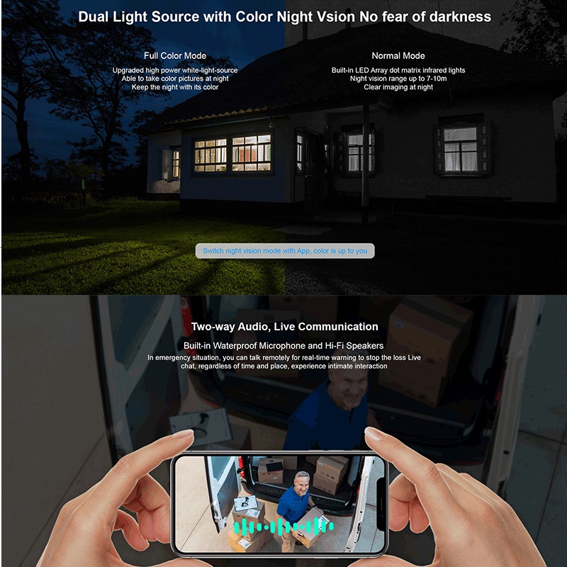 Specification:Sensor:1/3” COMS 2MP image sensorResolution:1920*1080Lens:3.6mmIR LED:8pcsNight vision:10m/33ftSpeaker:Built-inMicrophone:Built-inVideo compression:H.264+Storage:Cloud storage&SD card storage(MAX 128GB,SD card option include)WIFI:2.4GHz only,No support 5GPower:polymer rechargeable battery 5200mahWaterproof:IP66Working temperature:-10℃~55℃