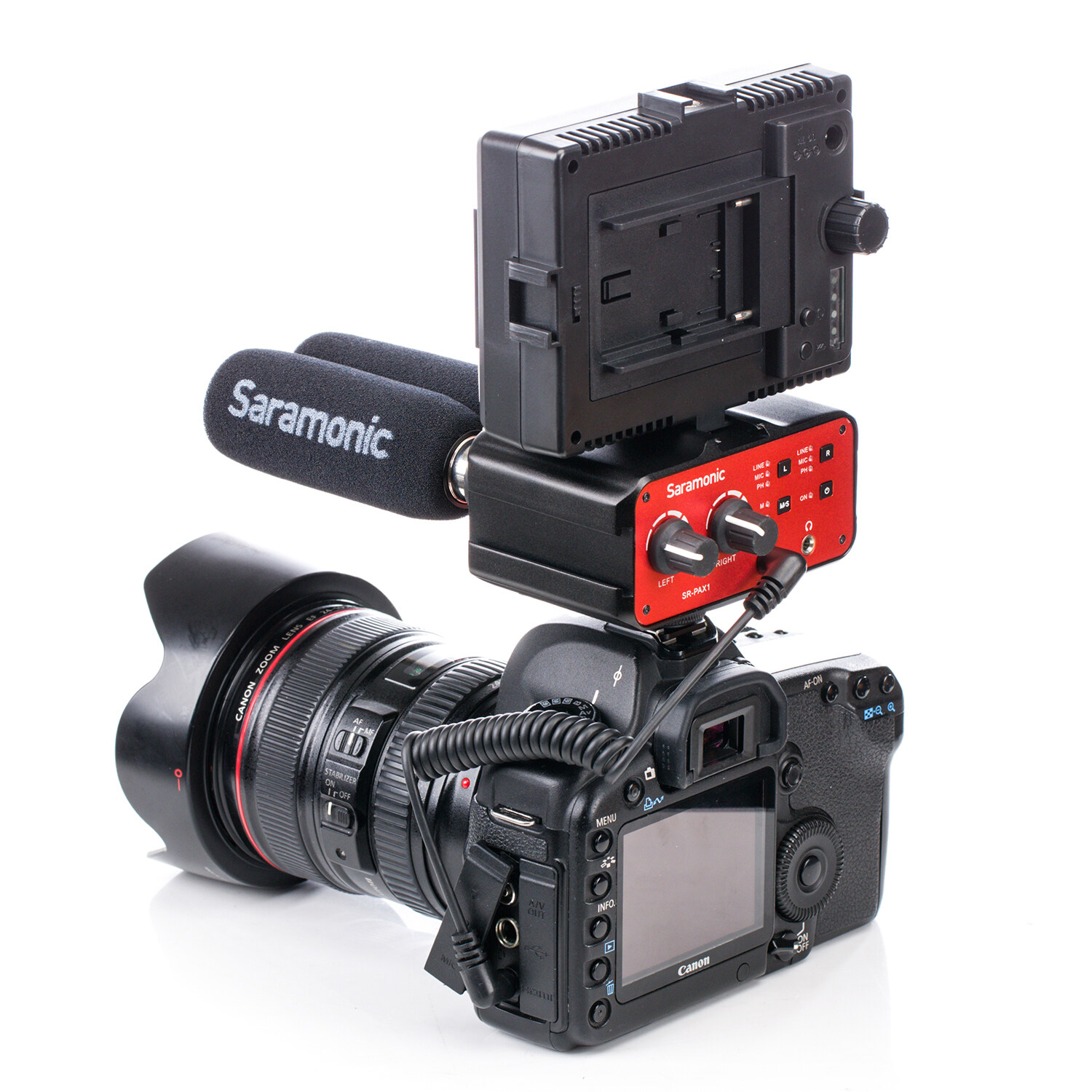 NEW Release- SR-PAX1 TWO-CHANNEL AUDIO MIXER WITH PHANTOM POWERThe Saramonic SR-PAX1 is a two-channel audio mixer with phantom power, specially designed for mirrorless digital camera, DSLR camera and camcorder with a microphone jack. It is ideal for recording professional quality audio from two sources and mixing them into your camera.With two sets of inputs, the SR-PAX1 accepts signals from a wide variety of mic or line level sources such as balanced XLR microphones, wireless microphones, guitars, or any musical instruments with a 6.35mm connector. The 3.5mm inputs are also ideal for connecting audio devices with a 3.5mm output such as a smartphone or an MP3 player. The input levels of each channel can be easily controlled with the dual control knobs. A phone jack allows you to monitor the audio in real time. The SR-PAX1 makes your recording work much easier.