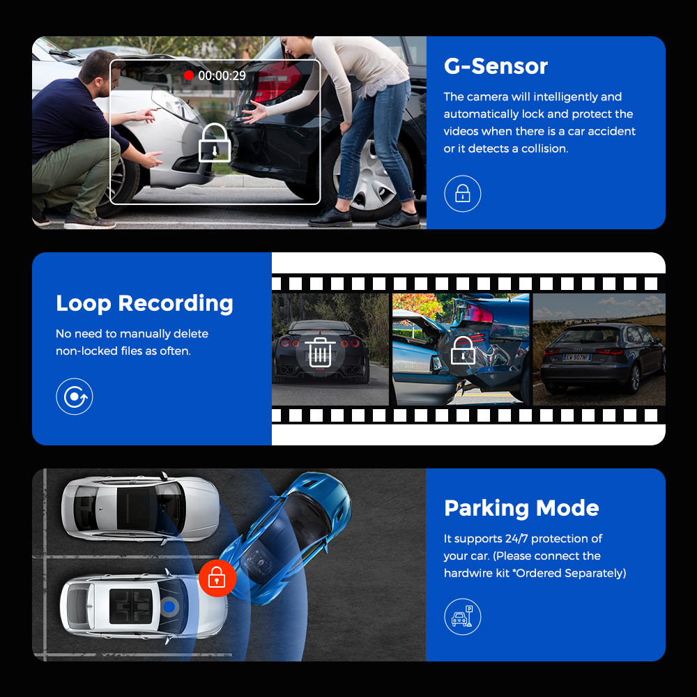 The camera will intelligently and automatically lock and protect the videos when there is a car accident or it detects a collision.