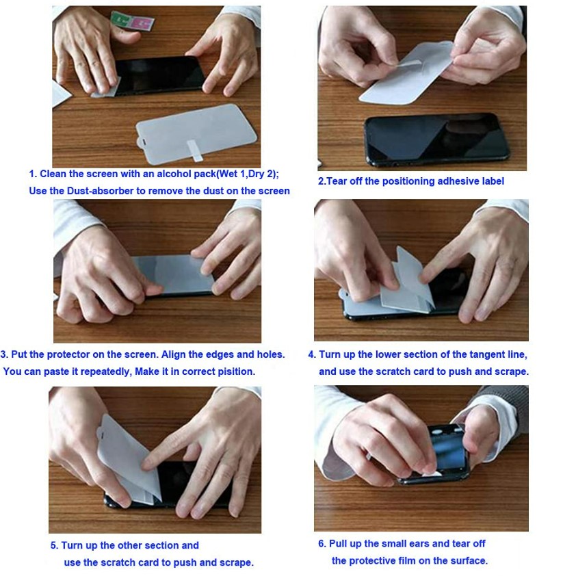 1. Clean and dry phone screen using wet then dry wipes provided. Use the dust sticker provided to remove any dust.