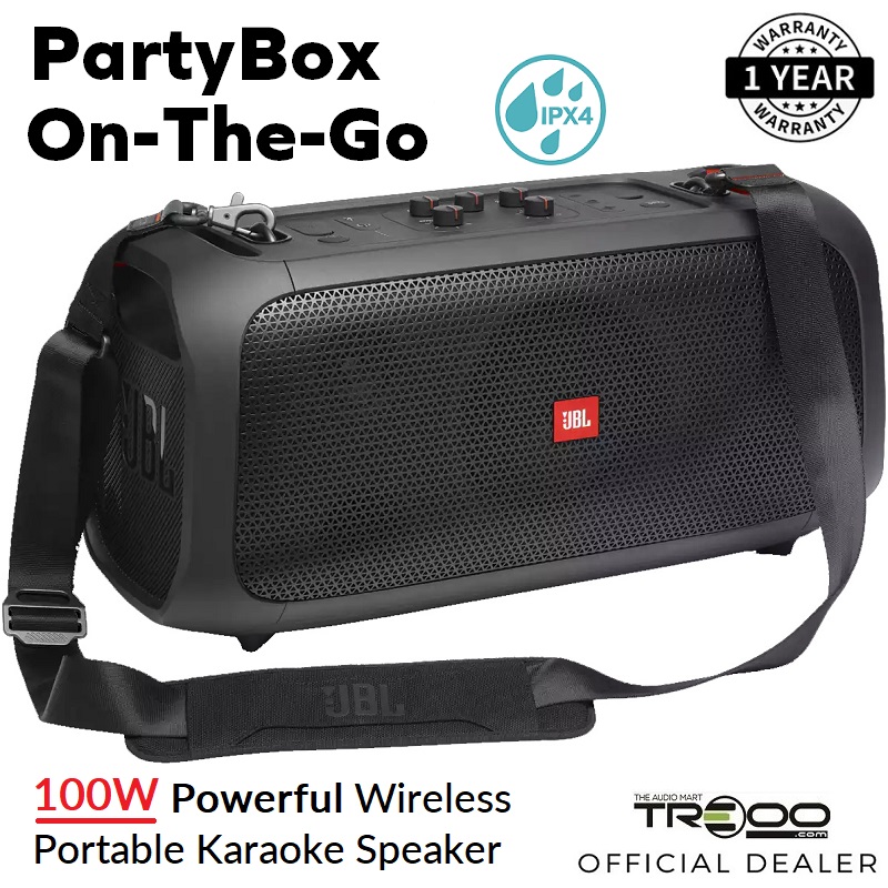 From beach parties to festivals, the JBL PartyBox On-The-Go lets you see, hear and feel the beat. Turn it up loud with 100 watts of powerful JBL Pro Sound, synched to a dazzling light show. Access your favorite tunes with Bluetooth, USB, AUX and TWS (True Wireless Stereo) connectivity, grab a friend and sing your hearts out with the JBL wireless mics, or use the instrument input to play along. With a bottle opener, padded shoulder strap, rechargeable battery and IPX4 splash-proof protection, the JBL PartyBox On-The-Go has everything you need to get the party started—and take it with you.