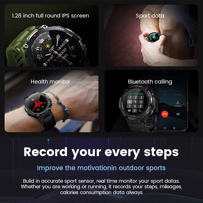 Product description:Model: K22 Smart WatchChip: Realtek8762CScreen: 1.28 inch IPS color Full touch screenOperation method: Full screen touch + buttonBluetooth version: Dual Bluetooth BET4.0+5.0Battery capacity: 400mAhCharging method: Magnetic adsorption chargingStandby time: about 30 dayUsage time: about 5~7 day(Use time is determined by frequency of use. Frequent use will reduce use time)Waterproof level: IP65 waterproof (Note: Please do not use it when swimming and showering)Compatible system: iOS 8.0 version above and Android 4.4 version aboveAPP name: Da FitSupport language: English,Japanese,German,French,Spanish,Arabic,Russian,Ukrainian,Portuguese