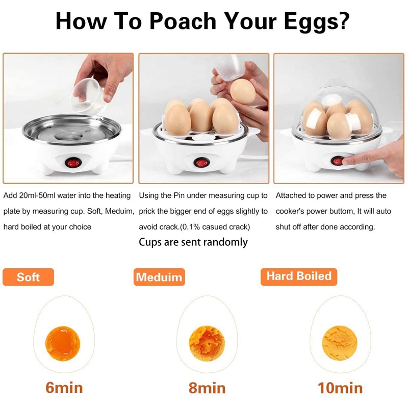 [Large capacity egg cooker]: The egg cooker tray can hold 7 eggs. It can boil soft, medium or hard eggs, just change the amount of water, and let the egg cooker do the rest. It can make breakfast for 2-3 people.