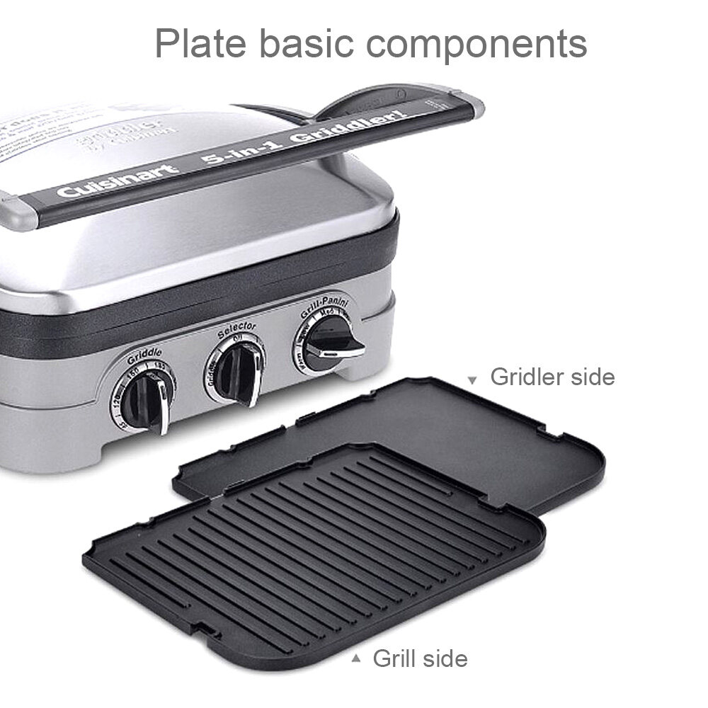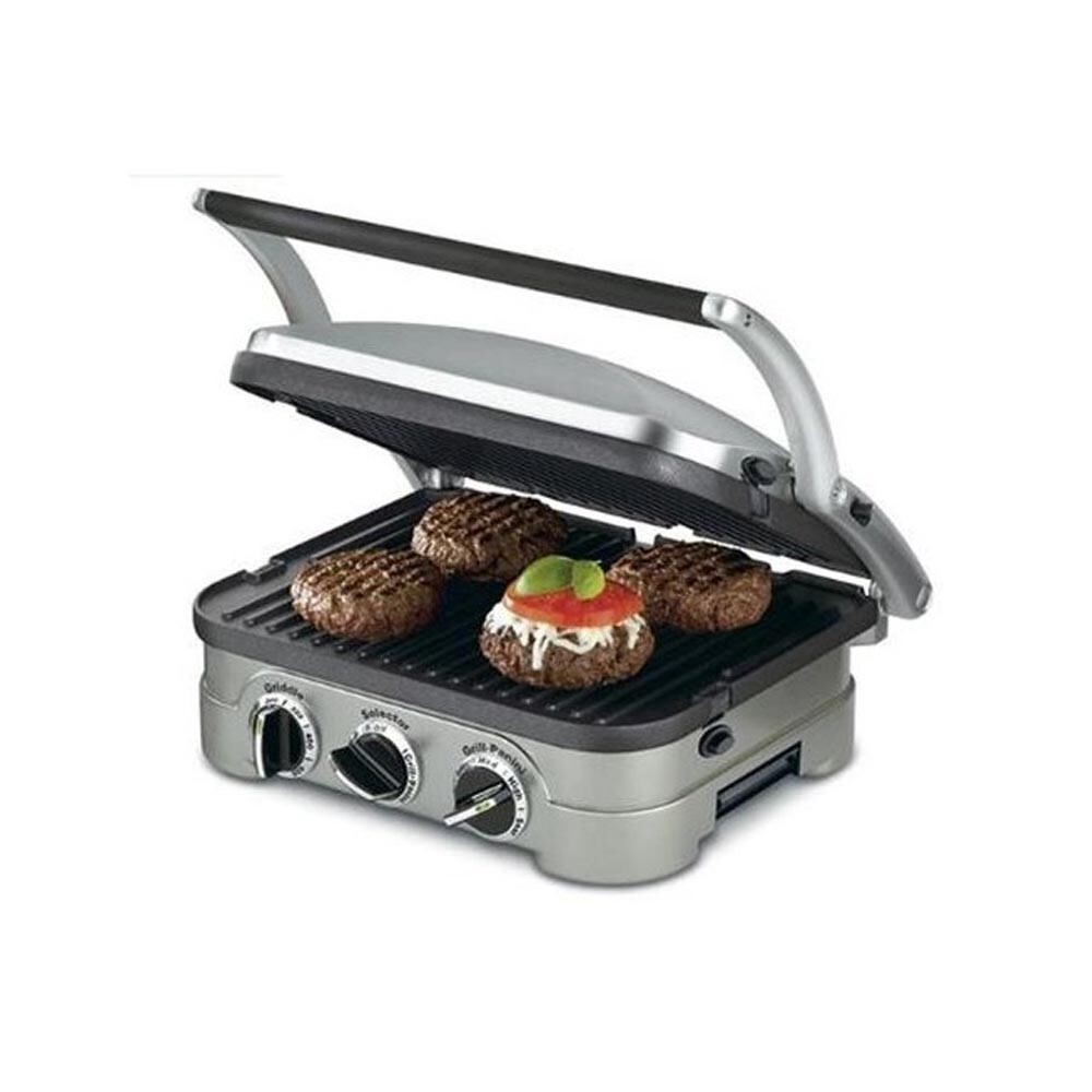 Brushed stainless-steel housing; sturdy panini-style handle; floating cover to adjust to thickness of food