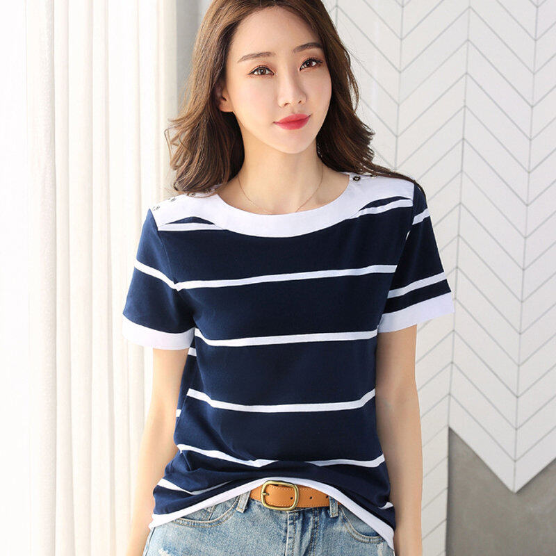 • INWPLLR Fashion T-shirt Women Tops Summer White And Blue Striped T-Shirts New Korean Short Sleeve O-neck Ladies Tshirt Large Size