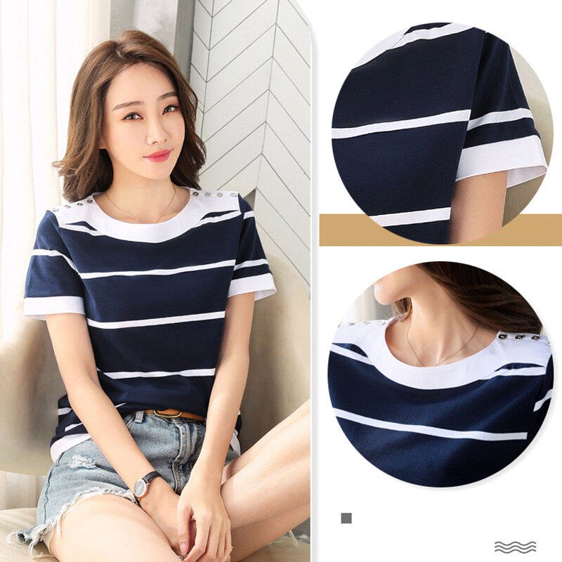 INWPLLR Fashion T-shirt Women Tops Summer White And Blue Striped T-Shirts New Korean Short Sleeve O-neck Ladies Tshirt Large Size