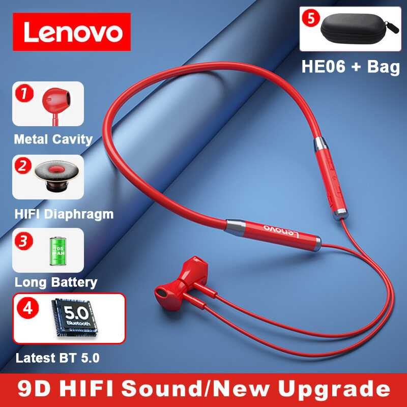 - Brand: Lenovo - Model: HE06/HE08 - BT Version: V5.0 - Color: Black/Red - Battery: 105mAH - Playtime: >10h(at 50% volume) - Speaker Diameter: 10mm - Standby time: About 120h - Wearing Way: In-ear Neckband - Effective Distance: About 10m(barrier-free)