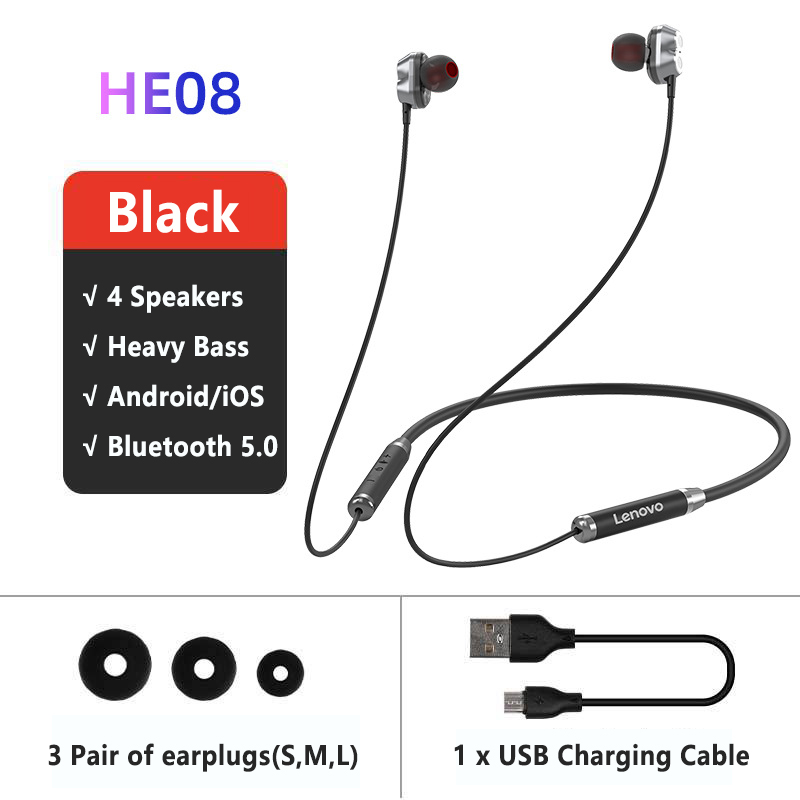 - Brand: Lenovo - Model: HE06/HE08 - BT Version: V5.0 - Color: Black/Red - Battery: 105mAH - Playtime: >10h(at 50% volume) - Speaker Diameter: 10mm - Standby time: About 120h - Wearing Way: In-ear Neckband - Effective Distance: About 10m(barrier-free)