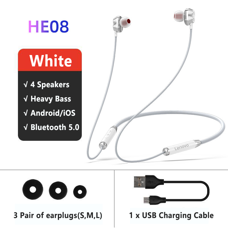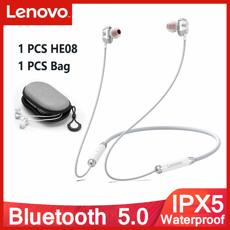 - Brand: Lenovo - Model: HE06/HE08 - BT Version: V5.0 - Color: Black/Red - Battery: 105mAH - Playtime: >10h(at 50% volume) - Speaker Diameter: 10mm - Standby time: About 120h - Wearing Way: In-ear Neckband - Effective Distance: About 10m(barrier-free)