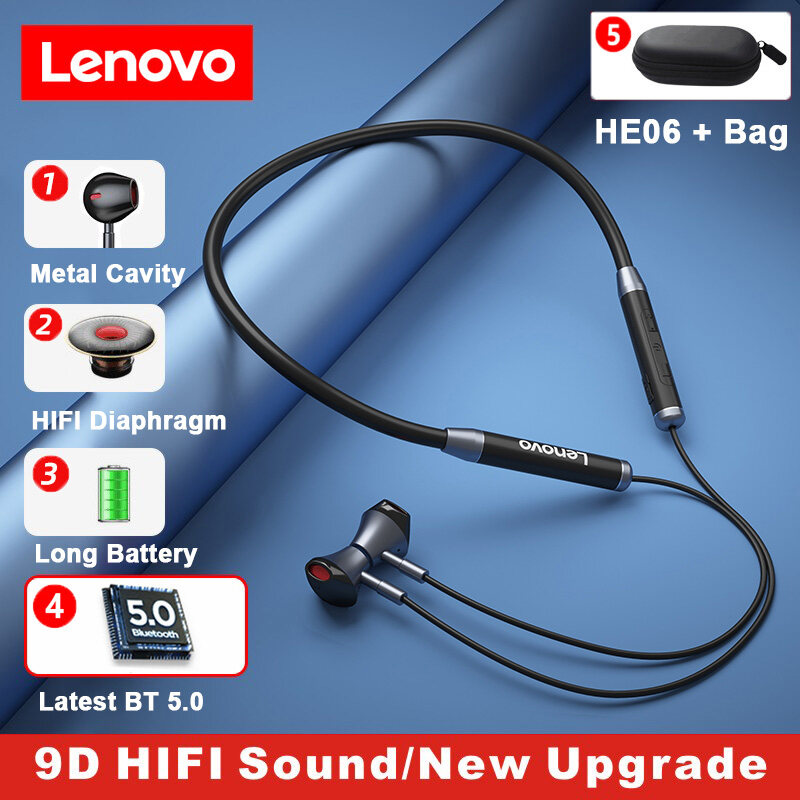 - Brand: Lenovo - Model: HE06/HE08 - BT Version: V5.0 - Color: Black/Red - Battery: 105mAH - Playtime: >10h(at 50% volume) - Speaker Diameter: 10mm - Standby time: About 120h - Wearing Way: In-ear Neckband - Effective Distance: About 10m(barrier-free)
