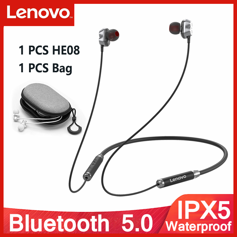 - Brand: Lenovo - Model: HE06/HE08 - BT Version: V5.0 - Color: Black/Red - Battery: 105mAH - Playtime: >10h(at 50% volume) - Speaker Diameter: 10mm - Standby time: About 120h - Wearing Way: In-ear Neckband - Effective Distance: About 10m(barrier-free)