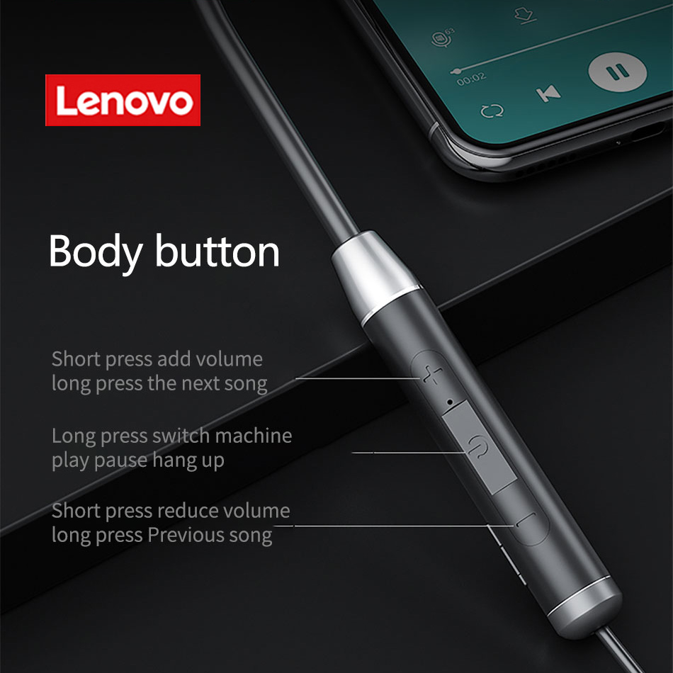 - Brand: Lenovo - Model: HE06/HE08 - BT Version: V5.0 - Color: Black/Red - Battery: 105mAH - Playtime: >10h(at 50% volume) - Speaker Diameter: 10mm - Standby time: About 120h - Wearing Way: In-ear Neckband - Effective Distance: About 10m(barrier-free)