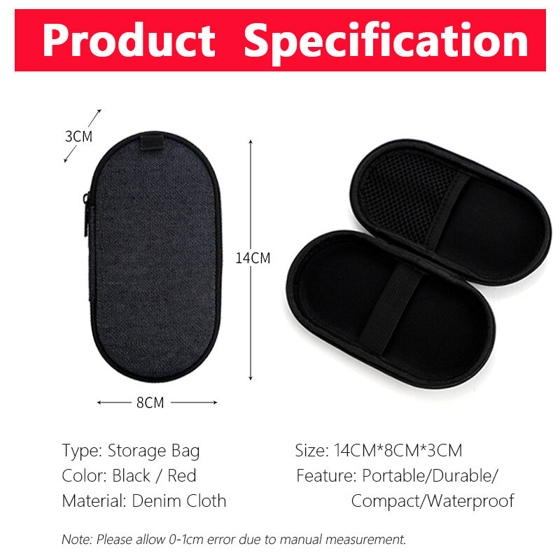 Type: Storage Bag Color: Black / Red Material: PU+Denim Cloth Size: 14CM*8CM*3CM Feature: Portable/Durable/Compact/Waterproof Note: Please allow 0-1cm error due to manual measurement.