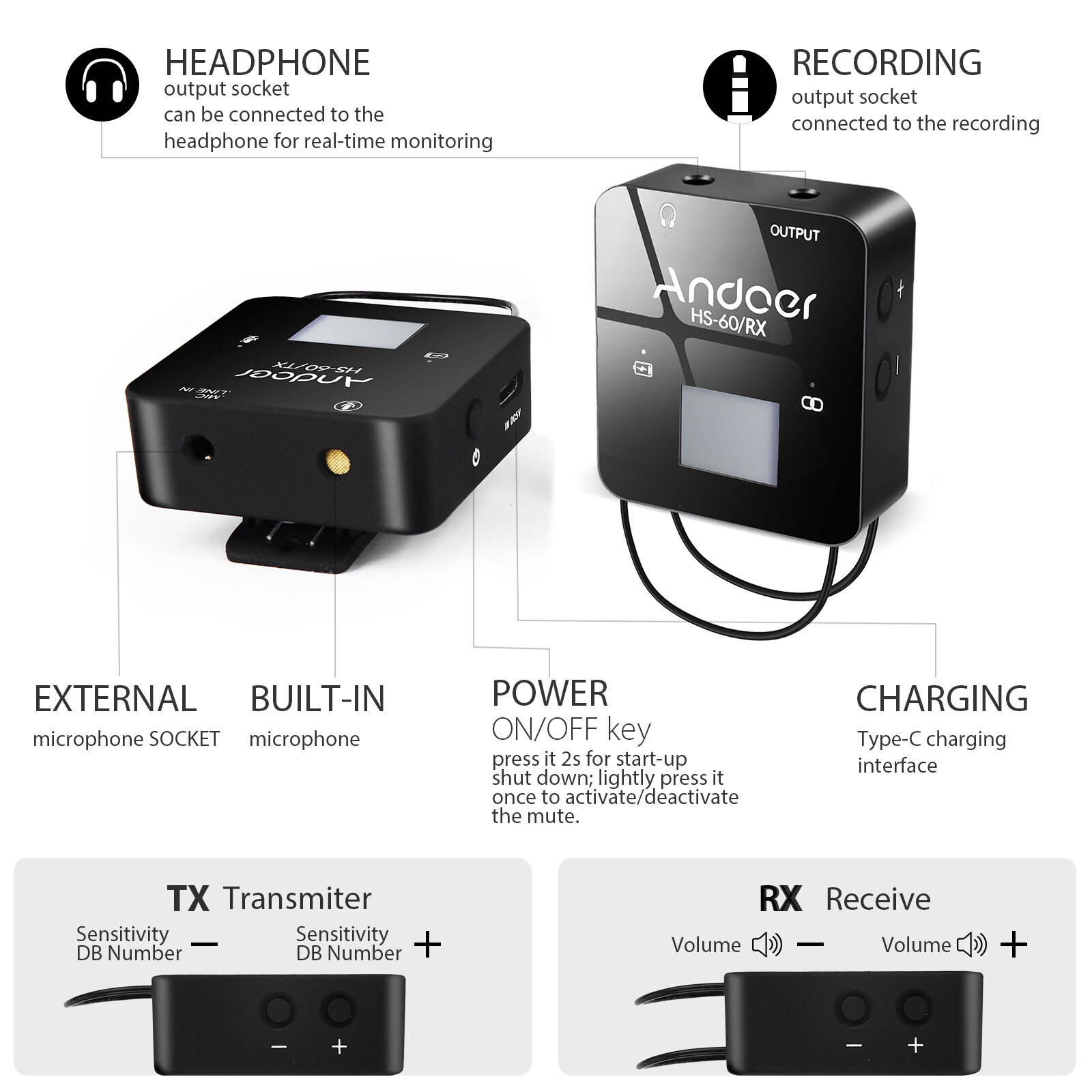 UHF Wireless Microphone System:Including mini size transmitter and receiver, adopts 566-594MHz frequency band and with 57 selectable UHF channels. 1 transmitter triggered by 1 receiver, avoid signal interference.