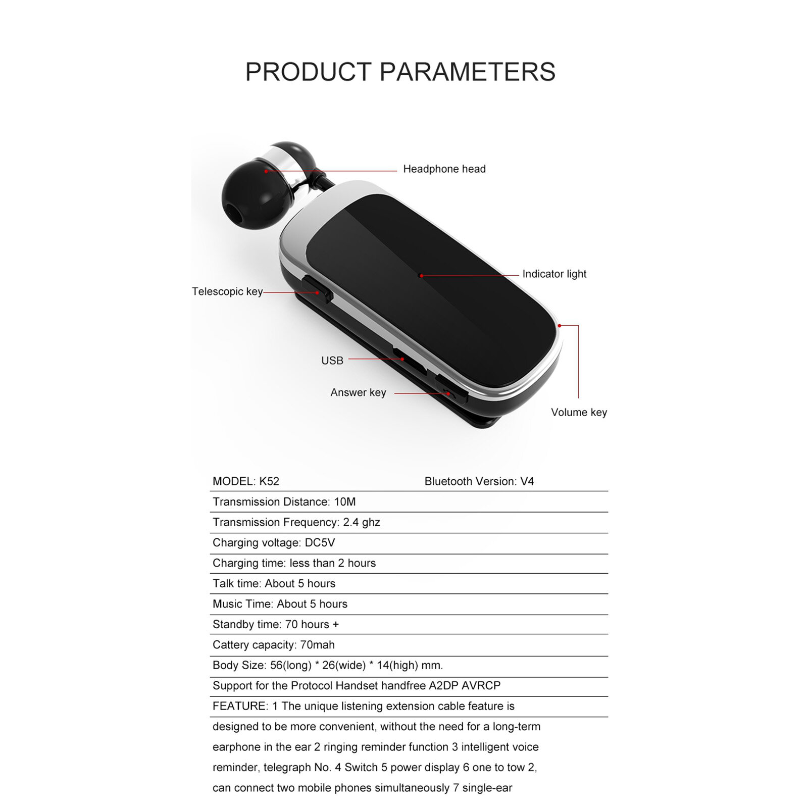 - Simple operation, free hands, headphone cable using high-quality wire, a key to receive through strict testing, durable, communication in the master