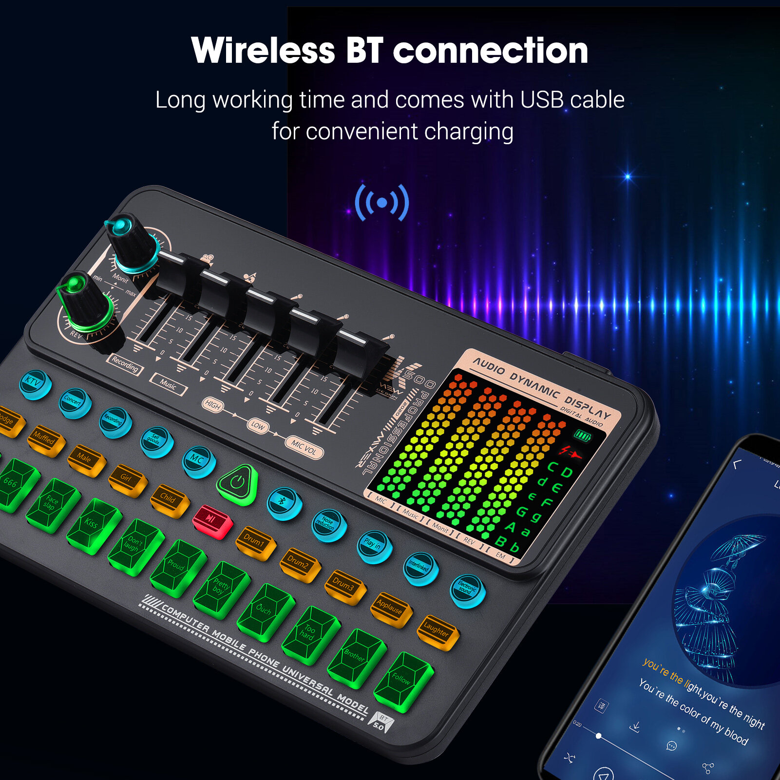 Built-in rechargeable lithium battery and compact size design, you can carry the sound card around and use it any time any where, and the colorful button light effects make it cool at night.