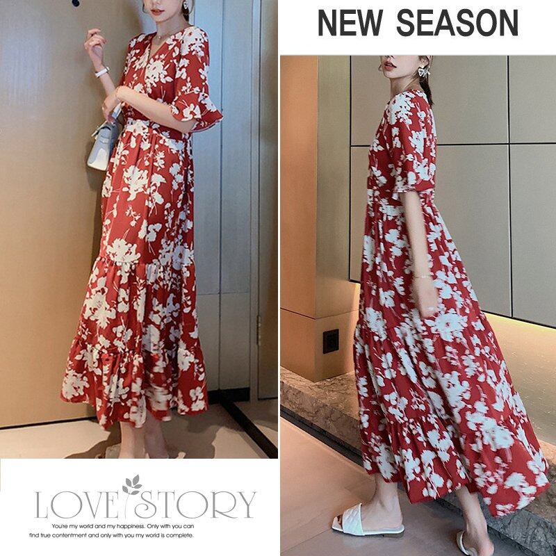 INWPLLR Japanese Style Women Dress Fashion Flower Printed Dress Korean Elegant Long Red Dress 2021 Summer Casual A-line Dresses Female
