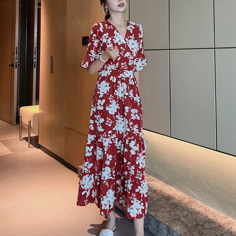 INWPLLR Japanese Style Women Dress Fashion Flower Printed Dress Korean Elegant Long Red Dress 2021 Summer Casual A-line Dresses Female