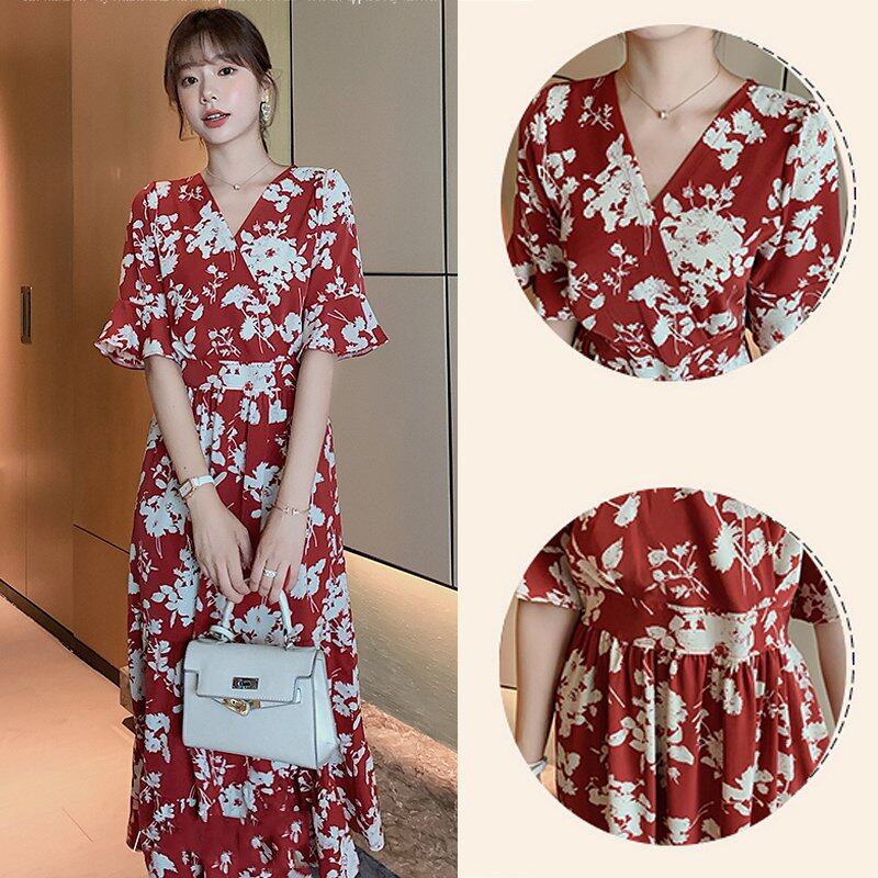 INWPLLR Japanese Style Women Dress Fashion Flower Printed Dress Korean Elegant Long Red Dress 2021 Summer Casual A-line Dresses Female