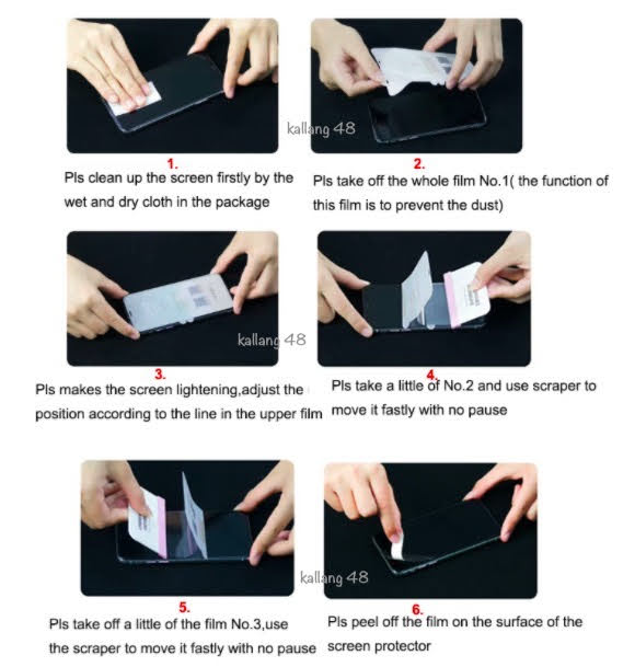 1. Clean and dry phone screen using wet then dry wipes provided. Use the dust sticker provided to remove any dust.
