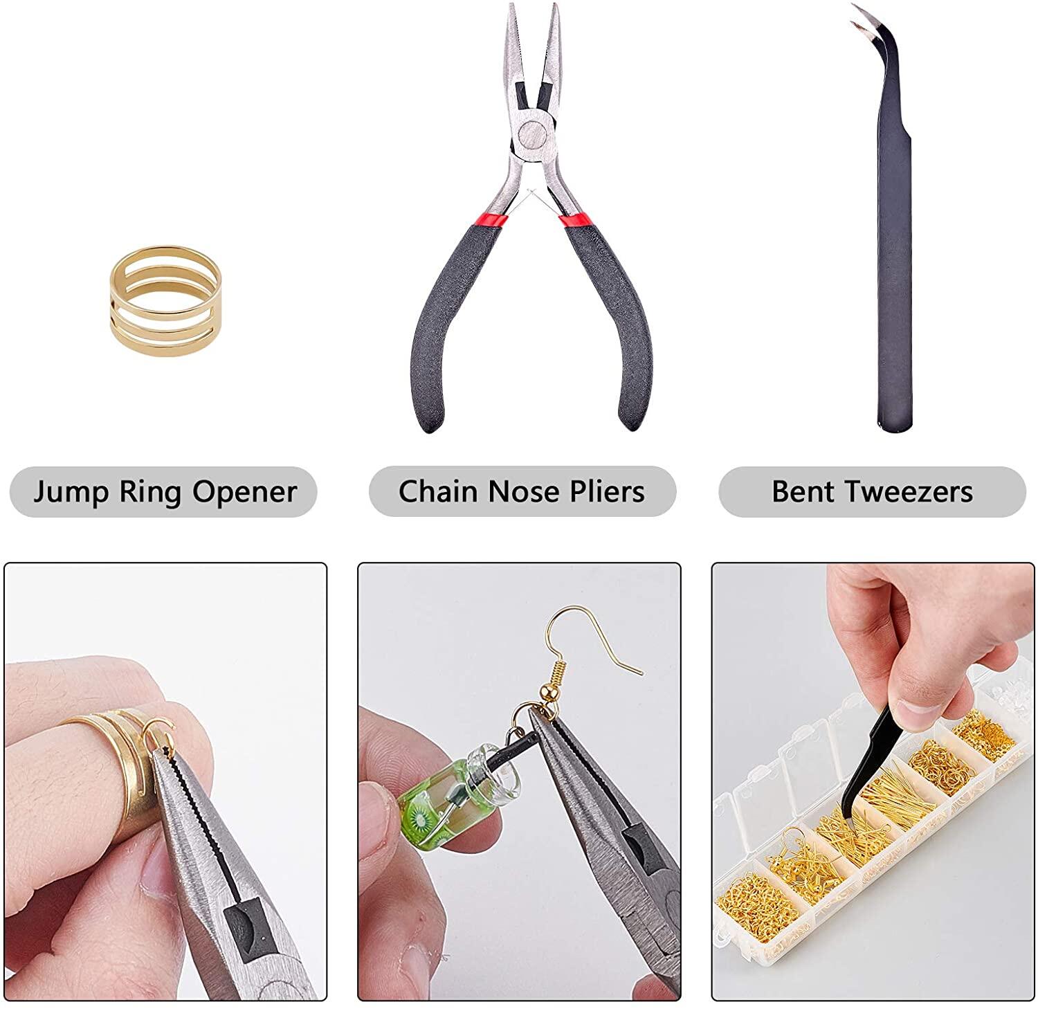 Earring Making Kit: package includes 100 x iron 6mm jump ring, 50 x iron bead caps, 30 x 304 stainless steel eye pins, 30 x 304 stainless steel flat head pins, 30 x brass earring hooks, 20 x iron chain extender, 100 x plastic ear nuts, 1 x jump ring opener, 1 x carbon steel needle nose plier, and 1 x stainless steel tweezer; totally 363 pcs in the package.