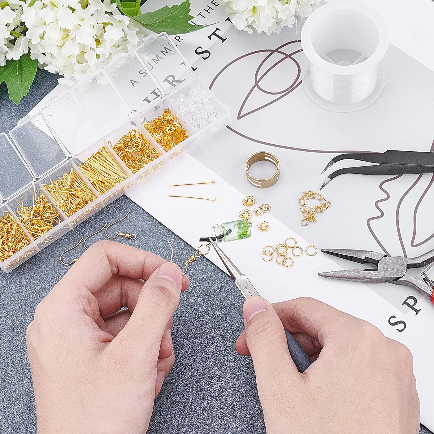 Earring Making Kit: package includes 100 x iron 6mm jump ring, 50 x iron bead caps, 30 x 304 stainless steel eye pins, 30 x 304 stainless steel flat head pins, 30 x brass earring hooks, 20 x iron chain extender, 100 x plastic ear nuts, 1 x jump ring opener, 1 x carbon steel needle nose plier, and 1 x stainless steel tweezer; totally 363 pcs in the package.